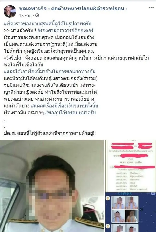 23ต.ค.61 กรณีที่ทางด้านเฟซบุ๊ก ชุดเฉพาะกิจ - ต่อต้านทหารปลอม&ตำรวจปลอม - โพสต์ภาพชายคนหนึ่งที่แอบอ้างเป็น รองศาสตราจารย์ด็อกเตอร์ หรือ รศ.ดร.สุรพศ อายุ 43 ปี ระบุข้อความว่า