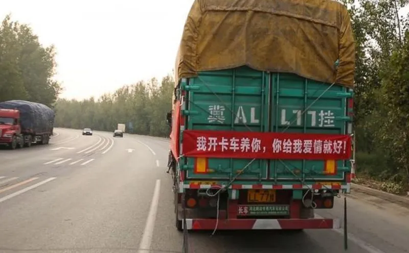 แค่เขามีความรักให้ก็พอแล้ว เจ้าของรถบรรทุกคันนี้คือ Yunge เธอขับรถมา 9 ปีแล้ว เร็วๆนี้ถูกพ่อแม่บังคับให้แต่งงาน เธอก็เลยทำป้ายมาแปะไว้ที่รถบรรทุกสุดที่รัก มีชาวเนตเห็นแล้วก็มาคอมเม้นท์ : ใบขับขี่ธรรมดาผมยังสอบไม่ผ่าน แต่เธอขับรถบรรทุก โคตรเจ๋ง