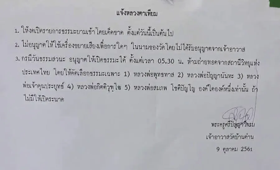 1.) ให้งดเปิดรายการธรรมะยามเช้าโดยเด็ดขาด ตั้งแต่วันนี้เป็นต้นไป