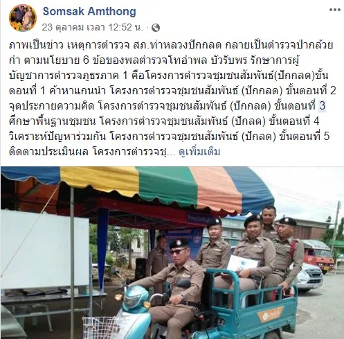"ภาพเป็นข่าว เหตุการตำรวจ สภ.ท่าหลวงปักกลด กลายเป็นตำรวจป่ากล้วย กำ ตามนโยบาย 6 ข้อของพลตำรวจโทอำพล บัวรับพร รักษาการผู้บัญชาการตำรวจภูธรภาค 1 คือโครงการตำรวจชุมชนสัมพันธ์(ปักกลด)ขั้นตอนที่ 1 ค้าหาแกนนำ โครงการตำรวจชุมชนสัมพันธ์ (ปักกลด) ขั้นตอนที่ 2 จุดประกายความคิด โครงการตำรวจชุมชนสัมพันธ์ (ปักกลด) ขั้นตอนที่ 3 ศึกษาพื้นฐานชุมชน โครงการตำรวจชุมชนสัมพันธ์ (ปักลด) ขั้นตอนที่ 4 วิเคราะห์ปัญหาร่วมกัน โครงการตำรวจชุมชนสัมพันธ์ (ปักลด) ขั้นตอนที่ 5 ติดตามประเมินผล โครงการตำรวจชุมชนสัมพันธ์(ปักลด) ขั้นตอนที่ 6 นำโครงการสู่การปฏิบัติ โครงการธงสายตรวจ โครงการตำรวจมาแล้วโครงการโรงพักเคลื่อนที่ โครงการปฏิบัติธรรมสัปดาห์พระพุทธศาสนา และโครงการระฆังทอง หลังจากมีนโยบาย สถานีตำรวจภูธรท่าหลวง จังหวัดลพบุรี ก้ได้ดำเนินการตามนโยาบาย วันนี้คือ ตำรวจโครงการตำรวจชุมชนสัมพันธ์ ปักกลด ตำรวจมาแล้ว ออกตรวจพื้นที่โดยใช้รถสามล้อเครื่องออกตรวจและประชาสัมพันธ์ตามพื้นที่รับผิดชอบเพื่อป้องกันเหตุ โดยมี พันตำรวจโท ศิริพงษ์ รอดขำ สวป.สภ.ท่าหลวง ทำหน้าที่ขับรถ และมีตำรวจอีก 4 นายนั่งท้ายมาแต่ไม่มีที่นั่งเป็นเบาะเลยตั้งใช้เก้าอี้ วิ่งออกตรวจไปตามถนนสายบัวชุม - ปากช่อง ตำบลหัวลำ อำเภอท่าหลวง จังหวัดลพบุรี แต่ไม่ทราบว่าโครงการปักกลด ทำไมกลายเป็นตำรวจป่ากล้วยไปได้ ตอนรถเสียหลักพุ่งลงไปในป่ากล้วยคนถ่ายภาพบอกว่าตกใจเลยบันทึกภาพเหตุตอนสำคัญไม่ทัน แต่โชคดีไม่มีผู้ใดได้รับบาดเจ็บ ก็เป็นอุทาหรณ์ เตือนใจ"