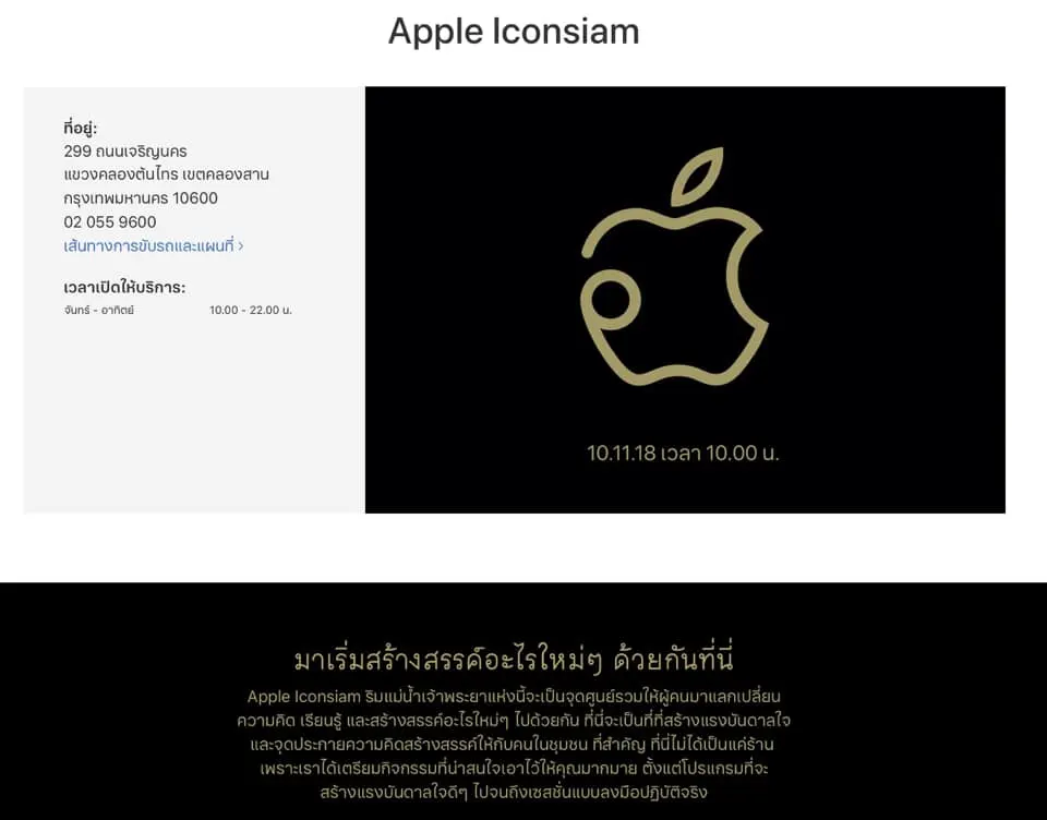 ยืนยันแล้ว Apple จะเปิดทำการ Apple Store แห่งแรกในประเทศไทย ณ Iconsiam ในวันที่ 10 พฤศจิกายน 2561 นี้ โดยโลโก้ที่ใช้เป็นตัว “อ” ผสมผสานกับโลโก้ของ Apple อย่างสวยงาม