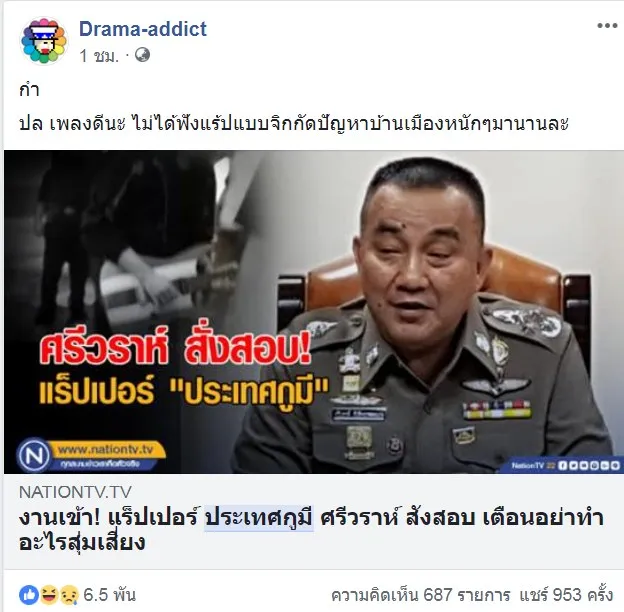 หลังจากเพจ Drama-addict โพสต์ข่าว ท่านศรีวราห์ลงมาเอง สั่งสอบ แร็ปเปอร์ "ประเทศกูมี" เตือน"อย่าทำอะไรสุ่มเสี่ยง"