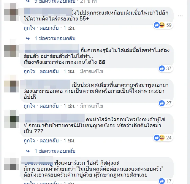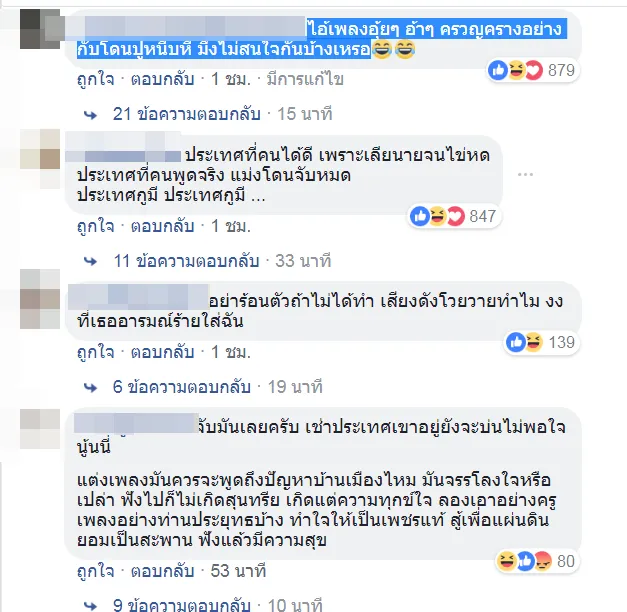 ด้านลูกเพจ บ้างก็ว่า ...ไอ้เพลงอุ้ยๆ อ้าๆ ครวญครางอย่างกับโดนปูหนีบ... ...ไม่สนใจกันบ้างเหรอ😂😂....