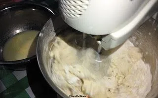 5. แป้งที่ได้จะเหนียวมาก ถ้าเครื่องตีกำลังน้อยจะตีไม่ไหว ให้เอาออกมานวดมือต่อ นวดให้ได้แป้งเนียน ๆ