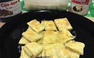 1. นำแป้งออกจากตู้เย็น รอให้คลายความเย็นลง ใช้มือกดและแผ่แป้งให้แบน (แป้งจะเหนียวยืดหยุ่น) นำกระทะขึ้นตั้งไฟ ใส่น้ำมันน้อย ๆ แล้วเอาแผ่นแป้งลงในกระทะแล้วพับ 4 ด้าน ทอดจนสุกกรอบ
