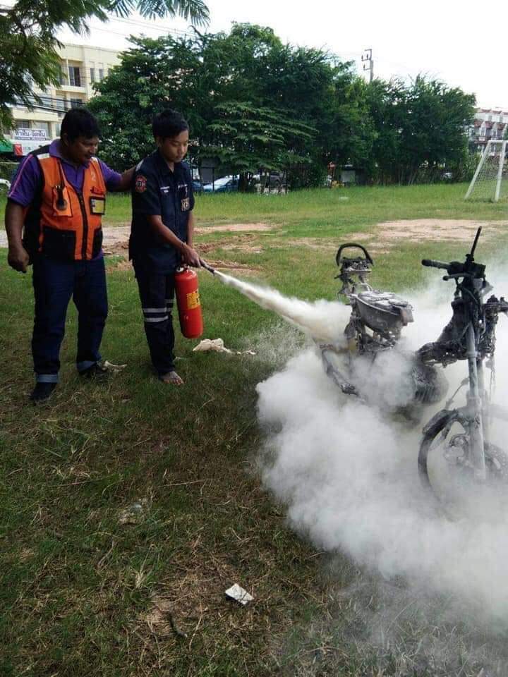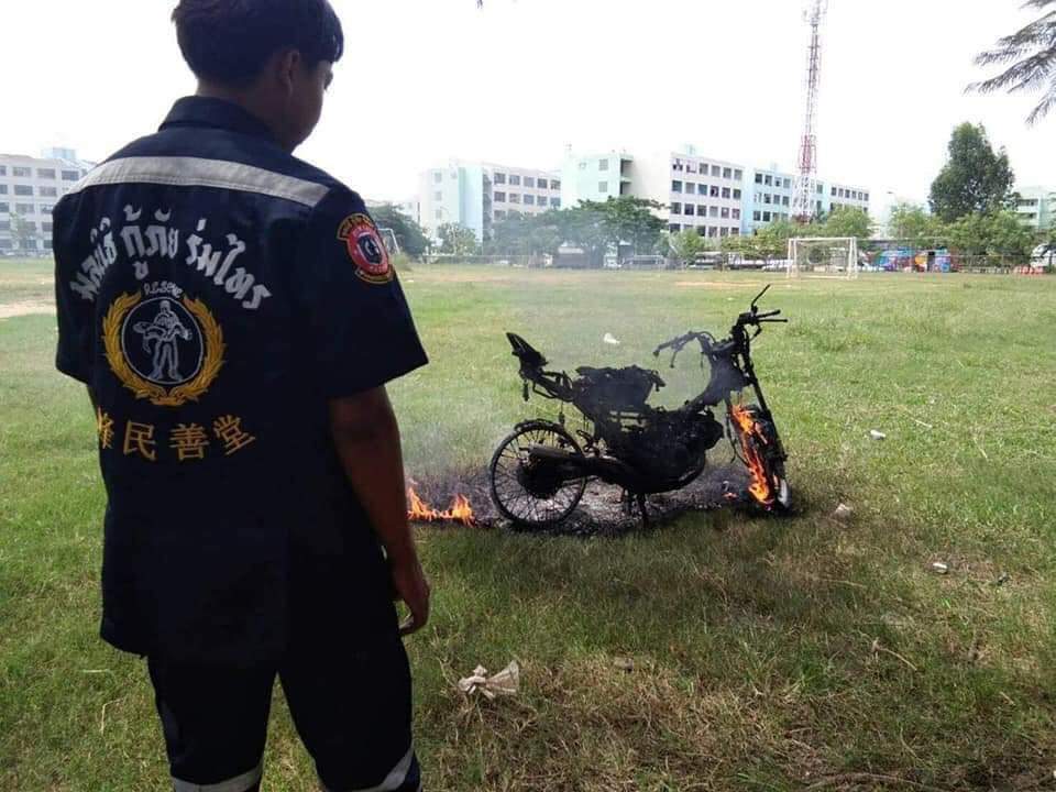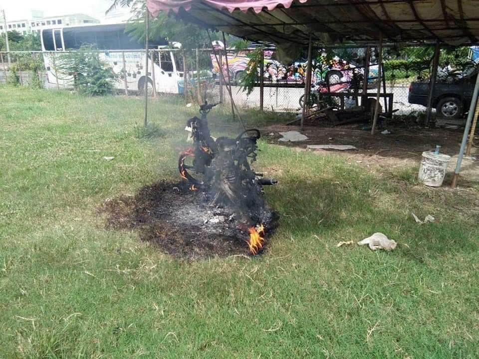 เบื้องต้นรับแจ้งว่าเจ้าของได้ดื่มสุรากับเพื่อนๆแล้วหากุญแจมอเตอร์ไซค์ไม่เจอ เลยจุดไฟ เผารถทิ้ง