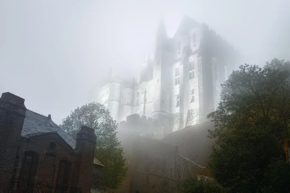 วิหารที่ถูกฉาบไปด้วยแสงสีขาวของ Mont Saint-Michel ใน Normandy ประเทศฝรั่งเศสในช่วงกลางคืนหมอก