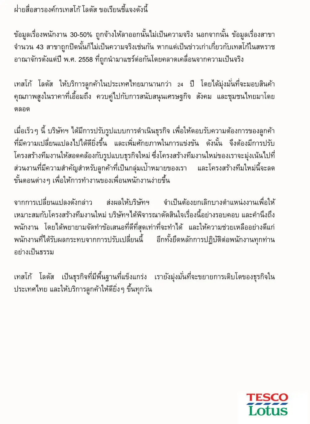 ล่าสุดวันนี้ 27 ตุลาคม ฝ่ายสื่อสารองคก์รเทสโก้โลตัส ชี้แจงเบื้องต้นว่า ข่าวนี้ไม่เป็นความจริง ประเด็นที่พูดกันในออนไลน์ เป็นเหตุการณ์ปรับตัวของเทสโก้โลตัวในราชอาณาจักรตั้งแต่ปี 2558 ที่ถูกนำมาแชร์ต่อกันโดยคลาดเคลื่อนจากความเป็นจริง แต่ก็ยอมรับว่าได้มีการปรับลดพนักงานบางตำแหน่ง เพื่อให้สอดคล้องกับโครงสร้างใหม่