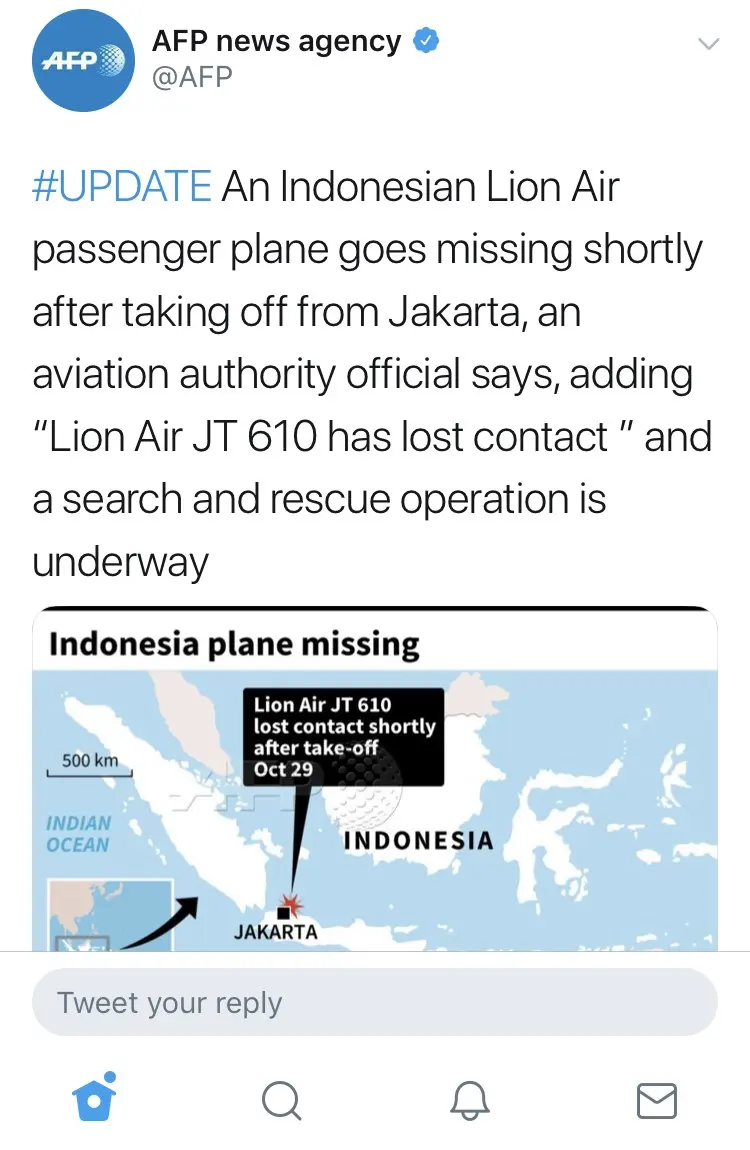 29 ตุลาคม 2561 เกิดเหตุเครื่องบินขาดการติดต่อที่อินโดนีเซียเครื่องบินสายการบิน Lion Air JT610 ขึ้นจากจาการ์ตาร์ ปลายทางปังคัลปินัง