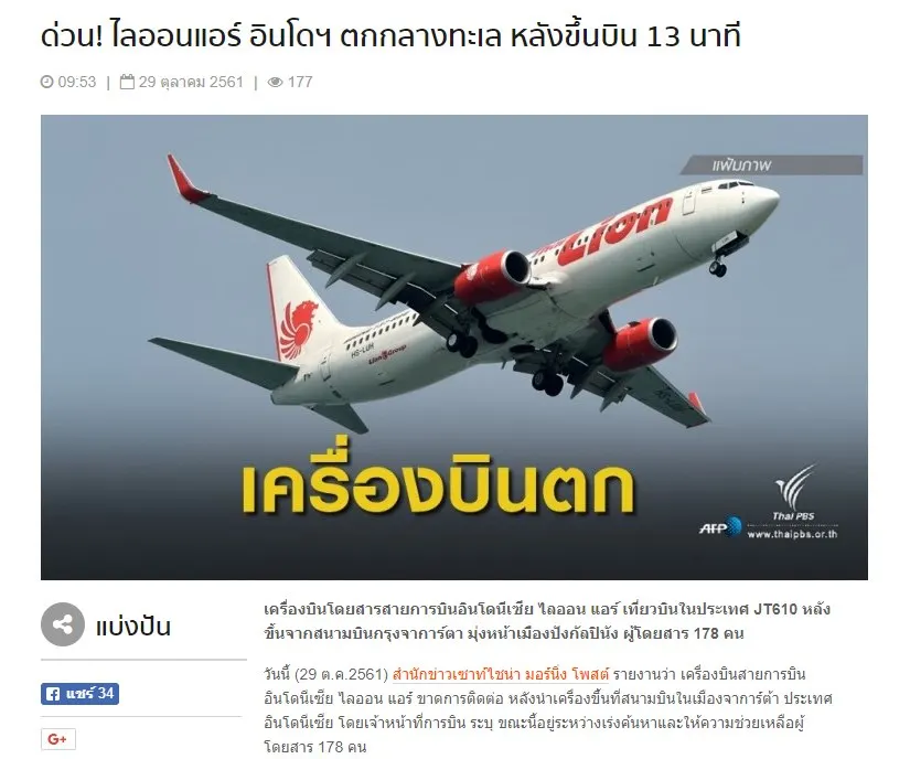 เครื่องบินโดยสารสายการบินไลออน แอร์ เที่ยวบินในประเทศ JT610 หลังขึ้นจากสนามบินกรุงจาการ์ตา มุ่งหน้าเมืองปังกัลปินัง เพียง 13 นาทีขาดการติดต่อ ต่อมาผู้สื่อข่าวรายงานว่า เที่ยวบินดังกล่าตกกลางทะเล ตามรายงานเบื้องต้นมีผู้โดยสาร 178ราย รวมลูกเรือทั้งสิ้นมีทั้งหมดมากกว่า 181 คน