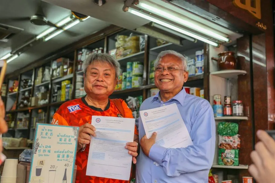 ตลอดเส้นทางที่เดินบนถนนเยาวราช ผ่านสําเพ็ง จนถึงท่าน้ำราชวงศ์ พบว่าบรรดาเถ้าแก่ผู้ประกอบการร้านค้าต่างก็ให้การต้อนรับคณะของพรรค รปช.รวมทั้งให้ความสนใจมาเข้าร่วมสมัครเป็นสมาชิกกันไม่ขาดสาย โดยมีหลายคนที่ตั้งใจมาเล่าประสบการณ์เก่าๆเมื่อครั้งเคยร่วมต่อสู้กับลุงกำนันฟัง จนคณะได้มาแวะพักรับประทานอาหารกลางวันกันที่ ฮั่วเซ่งฮง ร้านอาหารจีนเก่าแก่ต้นตำรับของเยาวราช ที่ใครๆก็แวะมาชิมกัน