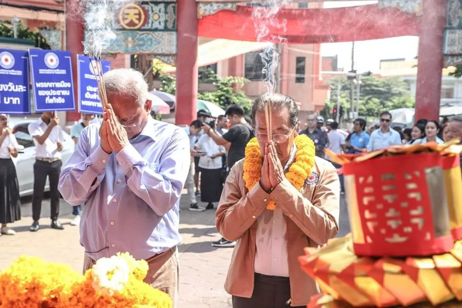 ช่วงบ่าย ม.ร.ว.จัตุมงคล โสณกุล และนายสุเทพ เทือกสุบรรณ ยังเดินพูดคุยทักทาย และเชิญชวนชาวไทยเชื้อสายจีนมาเป็นสมาชิกพรรค และเมื่อเดินมาถึงวัดเล่งเน่ยยี่ หรือวัดมังกรกมลาวาส จึงได้เข้าสักการะสิ่งศักดิ์สิทธิ์ที่คนเกิดในปีชงมักจะมาขอพรให้ปลอดภัย ก่อนจะเดินเข้าไปในตลาดล่งบ๊วยซึ่งเป็นชุมชนใหญ่ จุดนี้จึงมีพ่อค้าแม่ค้าและพี่น้องประชาชน ที่มาจับจ่ายใช้สอยให้ความสนใจเข้ามาขอถ่ายรูปเพื่อเป็นที่ระลึก รวมทั้งยังเข้ามาเพื่อสอบถามเจตนารมณ์ในการก่อตั้งพรรค รปช. ตลอดระยะทางด้วย