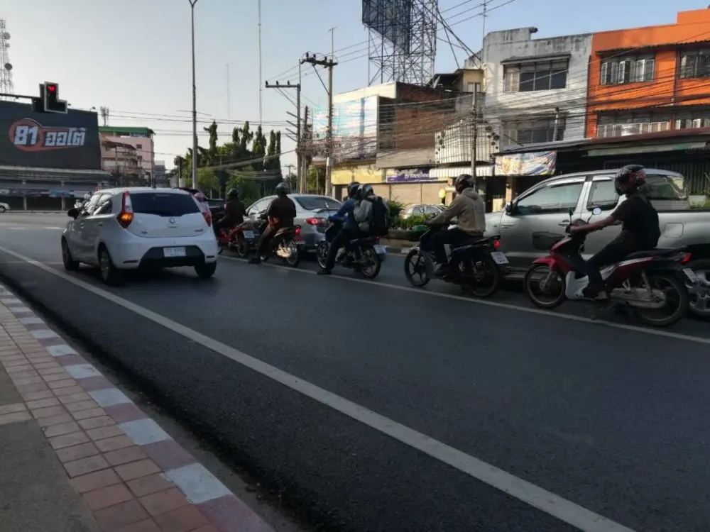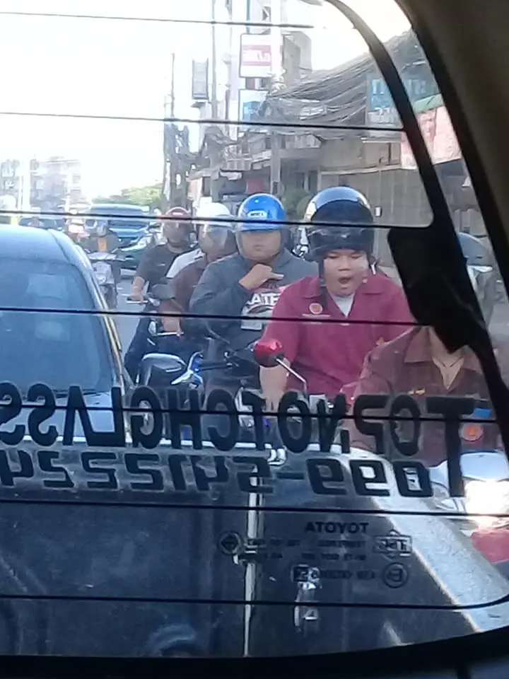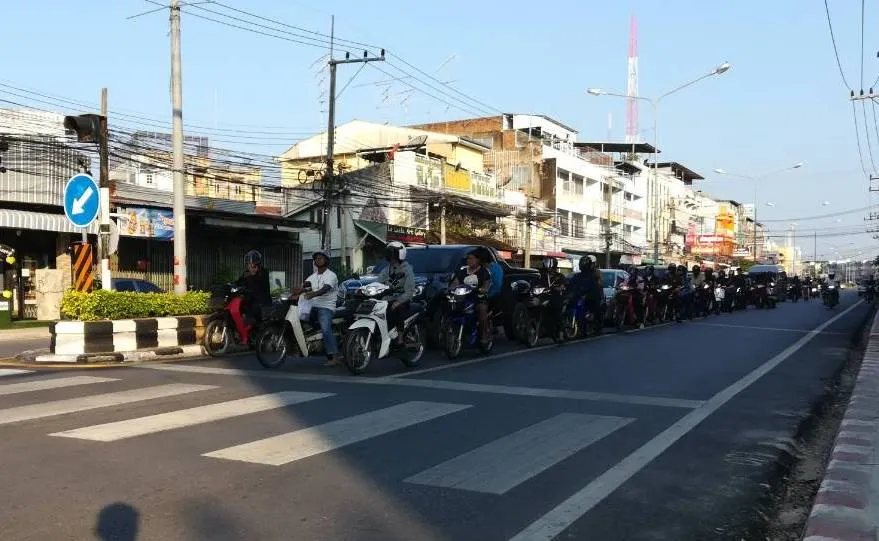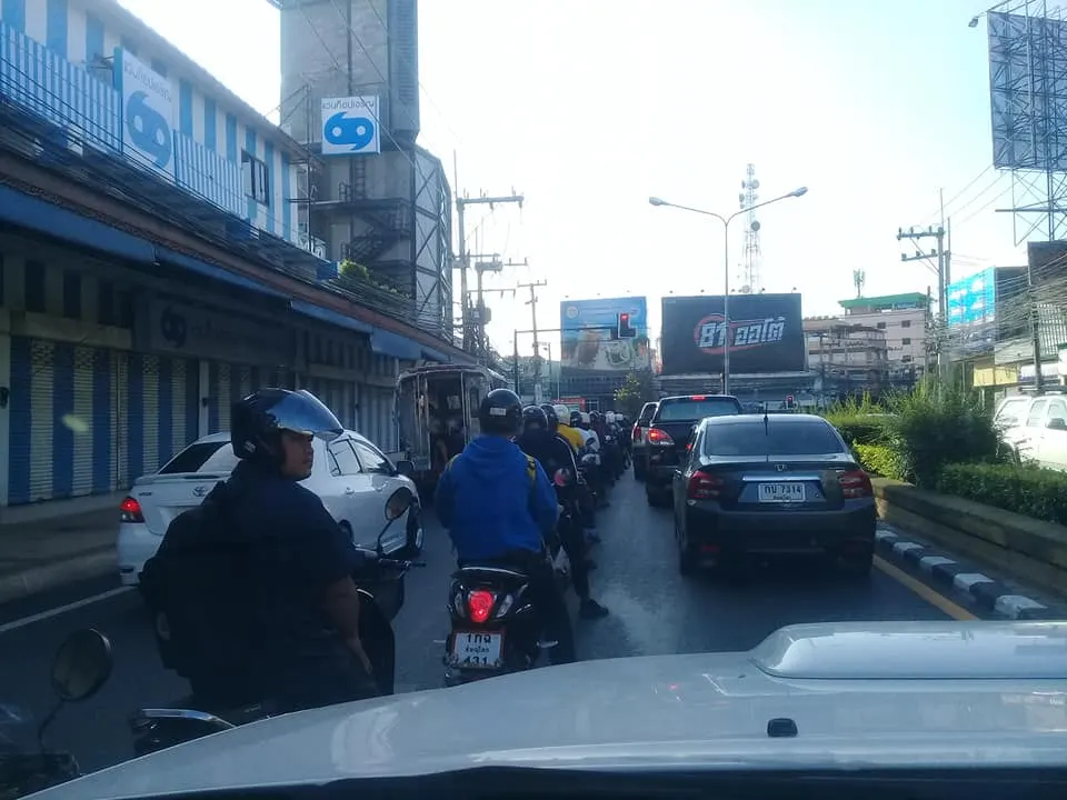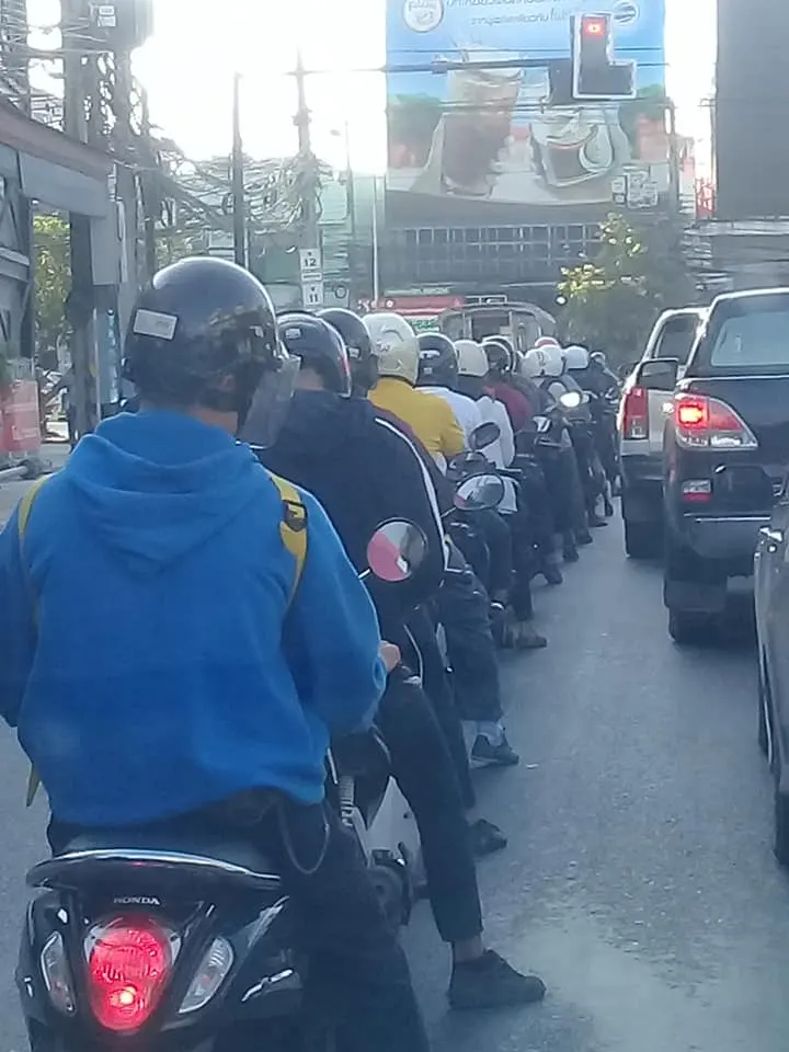 รู้สึกดีที่ #ไฟแดงห้าแยกโคกมะตูม เด็กเทคนิคต่อแถวยาวติดไฟแดงเป็นระเบียบ ในขณะ #ผู้ใหญ่บางท่าน ขี่แซงไปกระจุกหน้าไฟแดงให้รถติด...