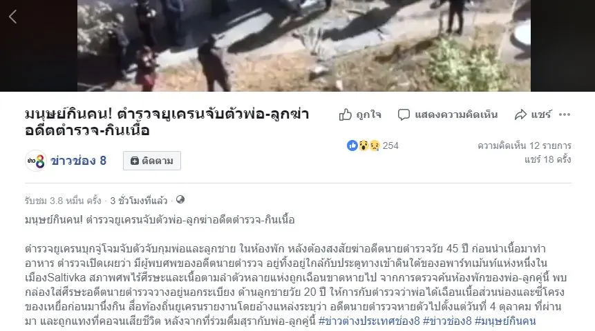 ตำรวจยูเครน จับกุมตัวพ่อและลูกชายคู่หนึ่ง หลังจากมีผู้พบว่า ทั้ง 2 คนฆ่าอดีตตำรวจอายุ 45 ปี กินเนื้อจากร่างของผู้ตาย และเก็บศีรษะเอาไว้ที่ระเบียงห้องพัก โดยทางเพจเฟสบุ๊ก ข่าวช่อง 8 ได้ระบุรายละเอียดว่า