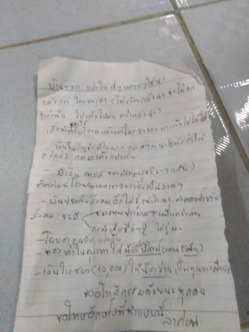 จากการตรวจสอบภายในห้องที่เกิดเหตุ ยังพบจดหมายที่ผู้ตายเขียนไว้จำนวน 2 แผ่น โดยได้ระบายความในใจ และขออโหสิกรรมกับพี่น้องที่ต้องทำแบบนี้ ซึ่งในจดหมายบางช่วงระบุว่า “เพิ่งรู้ว่าตนเองเป็นโรคซึมเศร้า คิดถึงแม่มาก อยากไปอยู่กับแม่แล้ว ยากมากที่จะอยู่โดยที่ไม่รู้จะอยู่เพื่อใคร”ลักษณะตัดพ้อว่าตัวเองเป็นคนไม่สำคัญ และในจดหมายยังได้กล่าวถึงทรัพย์สินที่ตนเองมีอยู่ ให้ญาตินำไปแบ่งกัน และบางส่วนให้เป็นทุนการศึกษากับลูกหลาน สุดท้ายในจดหมายบอกว่า ไม่ต้องจัดงานศพให้ เพราะได้บริจาคร่างไว้แล้ว ถ้าเขาไม่รับให้ใส่โลงเผาได้เลย