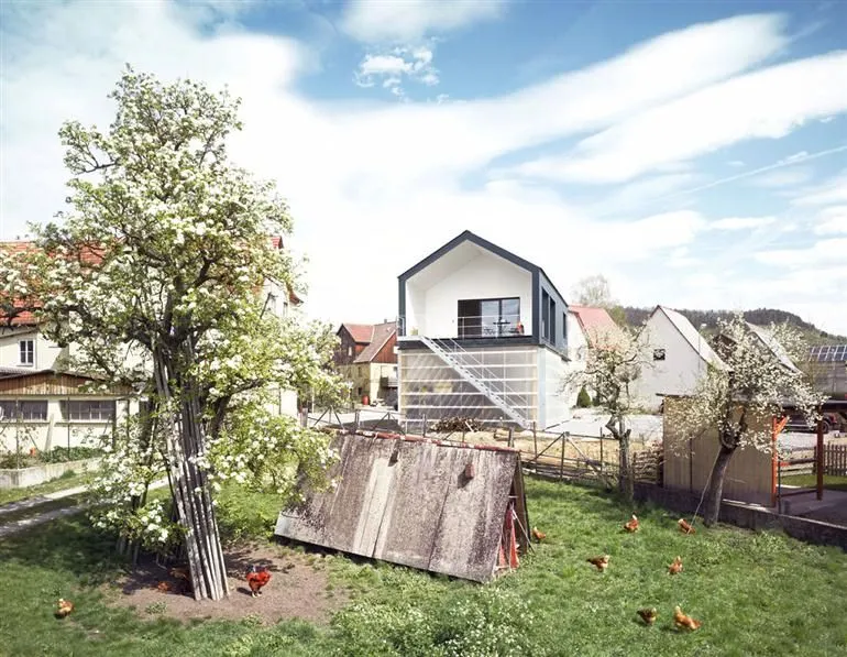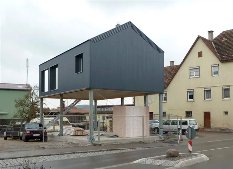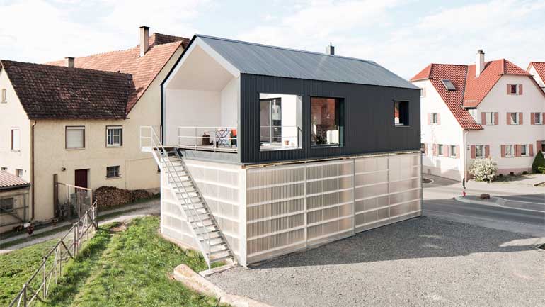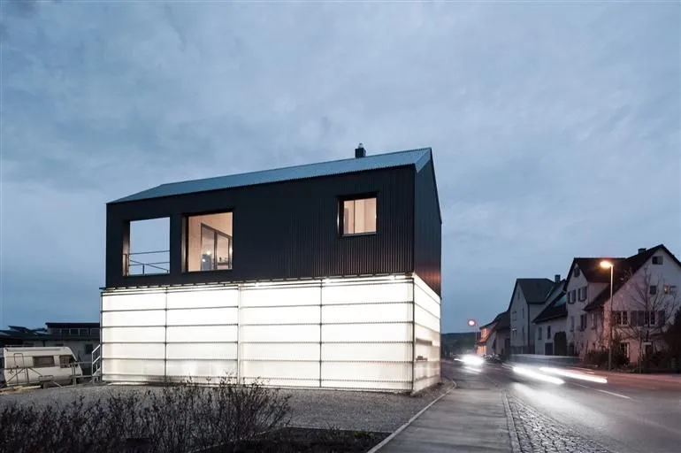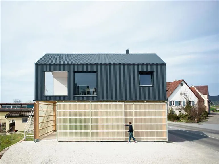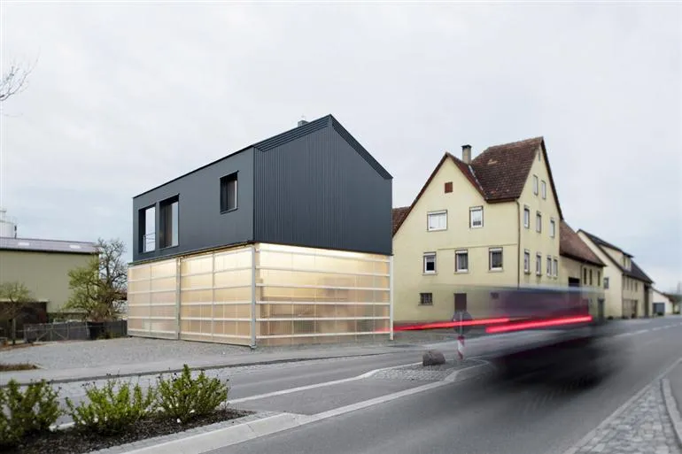 นี่คือบ้านโมเดิร์นแนวทันสมัยจากประเทศญี่ปุ่น เป็นบ้านในเมือง ตัวบ้านใช้โครงสร้างไม้และเหล็กเป็นหลัก ตัวบ้านยกสูงให้มีใต้ถุน พื้นที่ด้านล่างจึงออกแบบให้กลายเป็นโรงจอดรถในตัว ดั้นด้วยวัสดุโปรงแสง ส่วนชั้นบนนั้นใช้โครงแบบเรียบง่ายหลังคาจั่ว ผนังใช้เป็นวัสดุได้หลายแบบ อาจจะใช้ตู้คอนเทนเนอร์มมาประยุกต์ก็ได้ แต่ความไม่เหมือนใครคือชายคาที่สั้น ทำให้ดูมีความทันสมัยไม่น้อยเลยทีเดียว