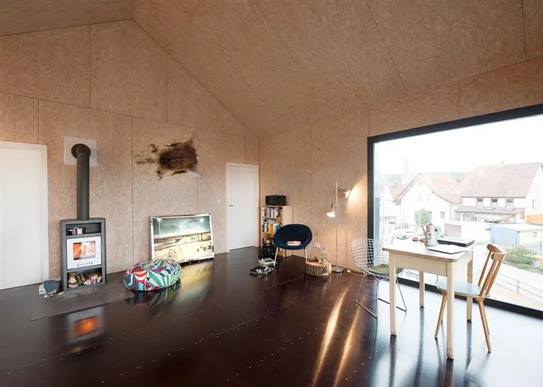 ตัวบ้านชั้นบนแบ่งพื้นที่บางส่วนให้เปิดโล่งรับอากาศ คล้ายระเบียงบ้านทั่วไปทแต่ยังอยู่ในชายคาหลัก ตกแต่งภายในแบบมินิมอล ใช้พื้นไม้สีเขช้ม ผนังลายไม้รวมถึงฝ้าเพดาน ที่ใช้แบบยกสูงโล่งไปตามแนวหลังคา ให้อารมณ์ปลอดโปร่ง ตกแต่งด้วยเฟอร์นิเจอร์น้อยชิ้น โดยบ้านหลังนี้มีขนาด 1 ห้องนอน 1 ห้องน้ำ พร้อมด้วยห้องโถงใช้งานร่วมกัน