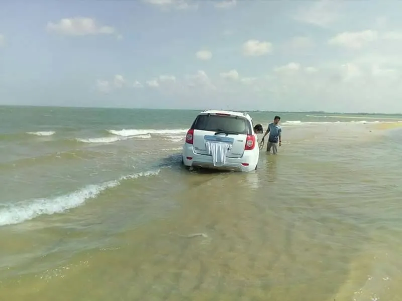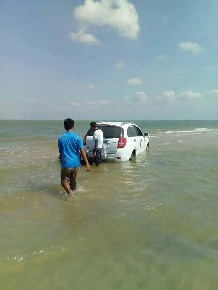 เหตุการ์ณที่แหลมตาซี (ทะเลปัตตานี) ผู้ขับรถมั่นใจ ในตัว 4X4 เลยฝ่าทรายไป ปรากฏว่า ติดทราย (ตอนนั้น น้ำยังไม่ขึ้น) จนมาเป็นตามภาพ น้ำขึ้น ผ่านไป 3 ชม. ก็ได้รถ คันแดงๆ ข้างหลังมาช่วยลาก