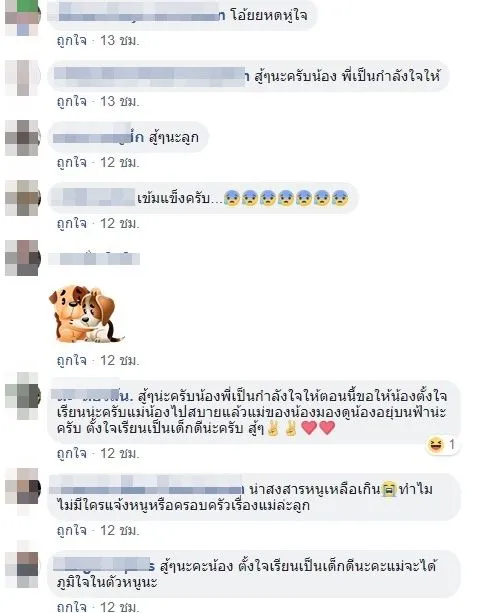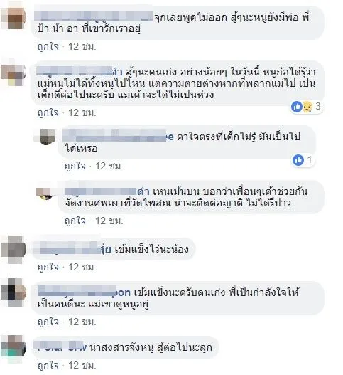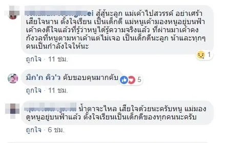 อย่างไรก็ตามชาวเน็ตต่างเศร้าสะเทือนใจกับเหตุการณ์ที่เกิดขึ้น ต่างมาเม้นต์ให้กำลังใจหนุ่มน้อยเป็นจำนวนมากบอกให้เข้มเเข็ง เพราะคุณเเม่คงมองอยู่บนฟ้า