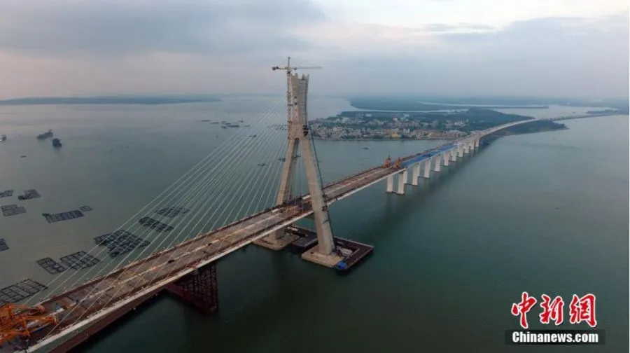 ภาพถ่ายทางอากาศของสะพานพูเฉียน เชื่อมเมืองเหวินชางกับเมืองไห่โข่วของมณฑลไห่หนานหรือไหหลำ ทางตอนใต้ของประเทศจีน ที่ขณะนี้กำลังอยู่ในระหว่างการก่อสร้าง