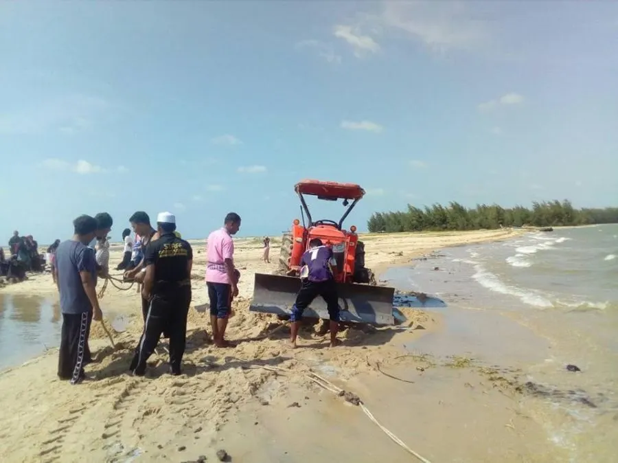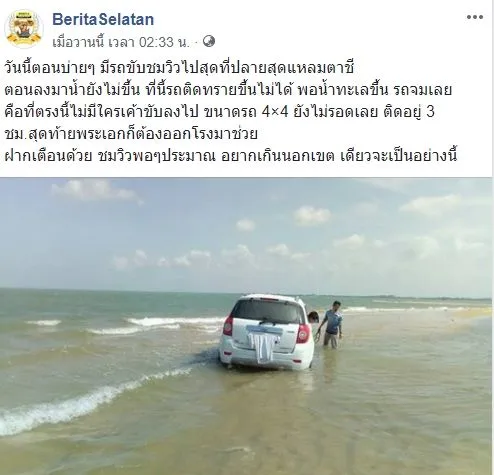 ซึ่งมีข้อความตามโพสต์ดังนี้ "วันนี้ตอนบ่ายๆ มีรถขับชมวิวไปสุดที่ปลายสุดแหลมตาชีตอนลงมาน้ำยังไม่ขึ้น ที่นี้รถติดทรายขึ้นไม่ได้ พอน้ำทะเลขึ้น รถจมเลยคือที่ตรงนี้ไม่มีใครเค้าขับลงไป ขนาดรถ 4×4 ยังไม่รอดเลย ติดอยู่ 3 ชม.สุดท้ายพระเอกก็ต้องออกโรงมาช่วย ฝากเตือนด้วย ชมวิวพอๆประมาณ อยากเกินนอกเขต เดียวจะเป็นอย่างนี้"