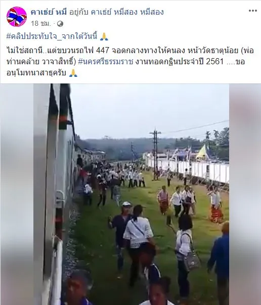 เรียกว่าได้เป็นคลิปประทับใจ ชาวพุทธเป็นอย่างมาก เมื่อชาวเน็ตแห่แชร์คลิป รถไฟขบวน 447 จอดส่งชาวบ้านที่โดยสารรถไฟเพื่อไปร่วมงานบุญทอดกฐินที่วัดธาตุน้อย (พ่อท่านคล้าย วาจาสิทธิ์) จ.นครศรีธรรมราช ซึ่งบริเวณดังกล่าว ไม่ใช่สถานีรถไฟ แต่ขบวนรถไฟดังกล่าวก็จอดให้ประชาชนลง ทำให้ชาวเน็ตแห่ร่วมอนุโมทนาบุญเป็นจำนวนมาก