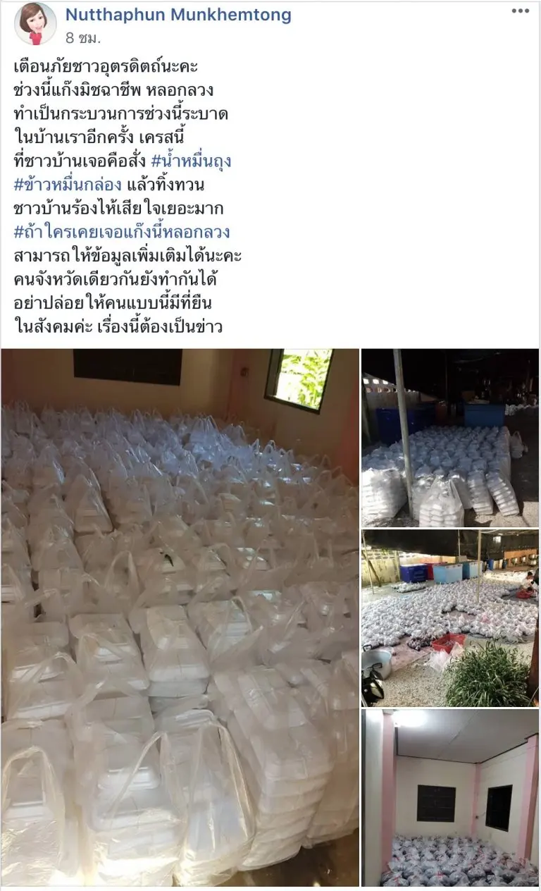 ผู้ใช้เฟซบุ๊ค คุณ Nutthaphun Munkhemtong ได้โพสท์เตือนภัยมิจฉาชีพ หลอกสั่งข้าวกล่อง 10000 กล่อง น้ำ 10000 ถุง แต่สุดท้ายหายไม่จ่ายเงินแม้แต่บาทเดียว โดยได้โพสท์ไว้ว่า