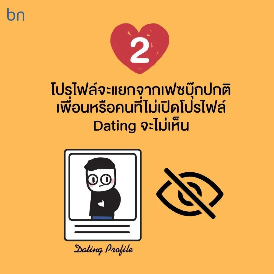 - เมื่อเป็นโปรไฟล์แยก เพื่อนบนเฟซบุ๊กหรือคนที่ไม่ได้เปิด Dating จะไม่มีทางเห็นโปรไฟล์เราได้