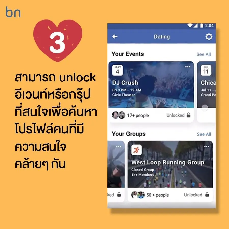 - Facebook Dating อาจจะไม่ได้มีโปรไฟล์คนอื่นขึ้นมาให้เลือกแบบสุ่มอย่างเดียว แต่เราสามารถเลือก (หรือ unlock) อีเวนท์หรือกรุ๊ปที่เราสนใจได้ เพื่อให้เฟซบุ๊กสุ่มคนที่มีความสนใจใกล้ๆ กันได้มากขึ้น
