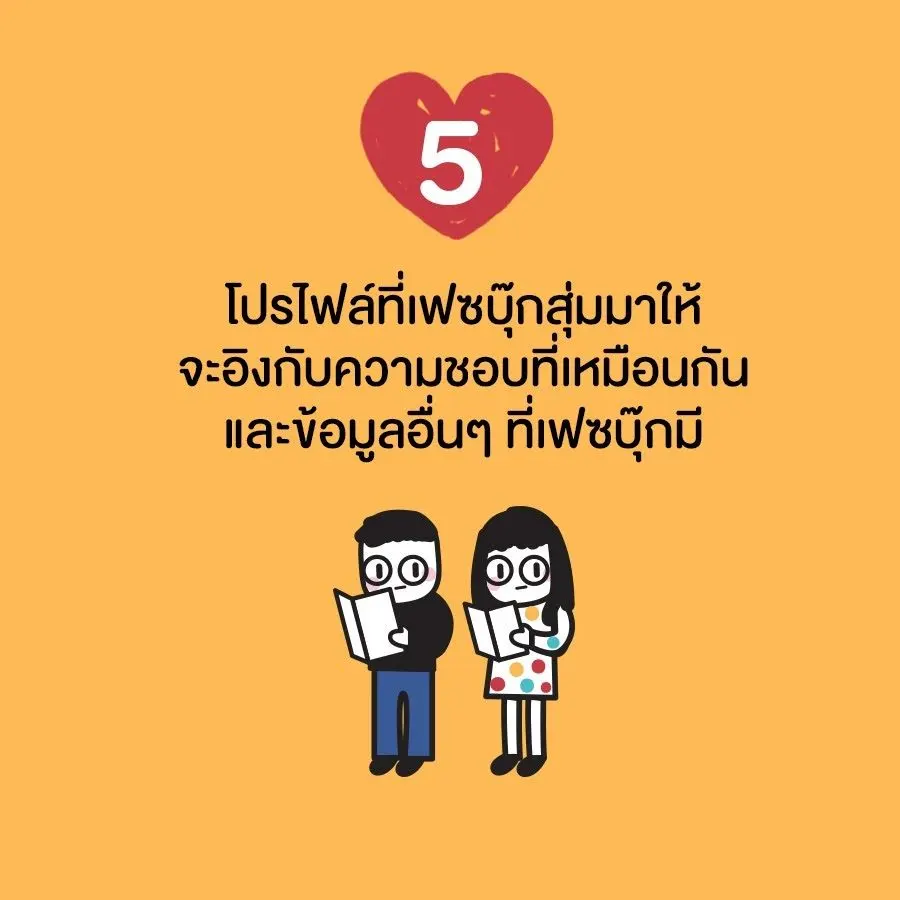 - ส่วนการสุ่มโปรไฟล์เพื่อจับคู่ จะอิงจากข้อมูลที่เรา unlock และข้อมูลอื่นๆ ที่เฟซบุ๊กมี เพื่อให้ได้คนที่มีรสนิยมตรงกันมากที่สุด