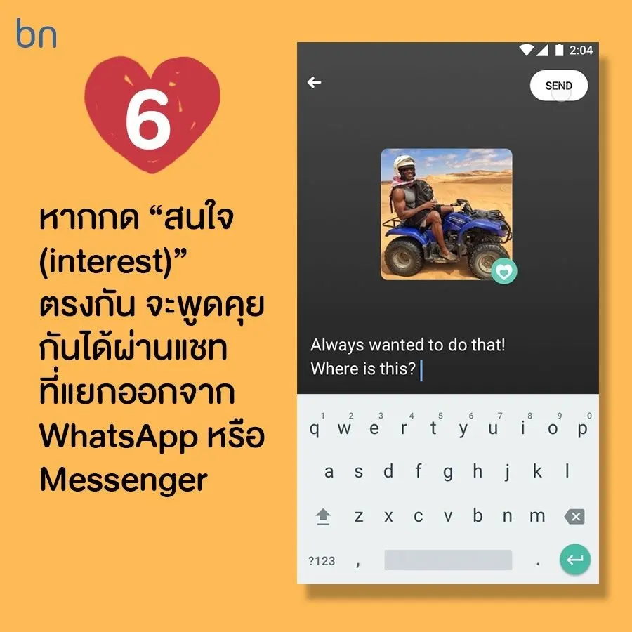 - เมื่อเฟซบุ๊กสุ่มโปรไฟล์คนอื่นมาให้ หากไม่สนใจเราสามารถกดผ่าน (Pass) หรือหากรู้สึกคนนี้สเป๊คเลย สามารถกดสนใจ (Interested) ได้ และหากกดสนใจตรงกัน จะต้องเลือกรูปบนโปรไฟล์อีกฝั่ง เพื่อเปิดบทสนทนา ซึ่งช่องแชทตรงนี้จะแยกออกจาก Messenger หรือ WhatsApp เป็นเอกเทศ