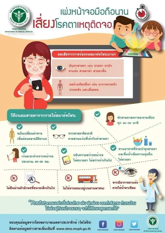 ทั้งนี้ หากมีปัญหาสายตาควรปรึกษาจักษุแพทย์เพื่อตรวจหาความผิดปกติและรับการรักษาอย่างทันท่วงที อย่างไรก็ตามสามารถถนอมดวงตาได้ด้วยวิธีการดังนี้กระพริบตาให้บ่อยเมื่ออยู่หน้าจอเพื่อป้องกันตาแห้ง