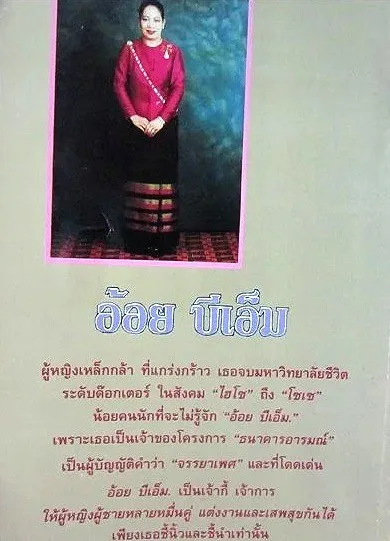 โดยทางสมาชิกเฟซบุ๊กฯ ท่านนี้ได้เล่าว่า (จากแฟนเฟสผู้ไม่ประสงค์ออกนาม)หญิงชราท่านนี้ เธอเป็นเจ้าของตำนานธนาคารอารมณ์ ผู้โด่งดังและเคยทรงอิทธิพลต่อผู้ชายในสังคมชั้นสูง ในนาม ‘อ้อย บีเอ็ม’