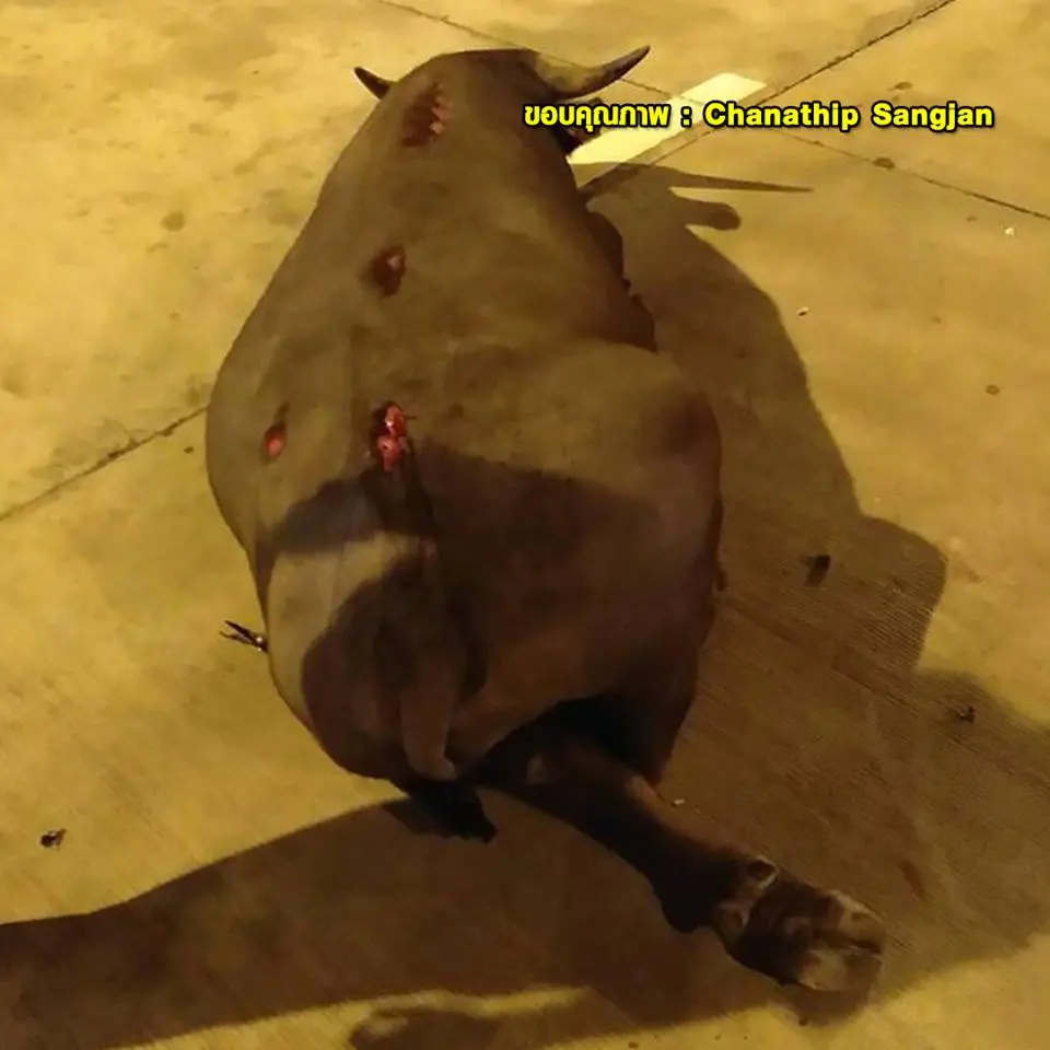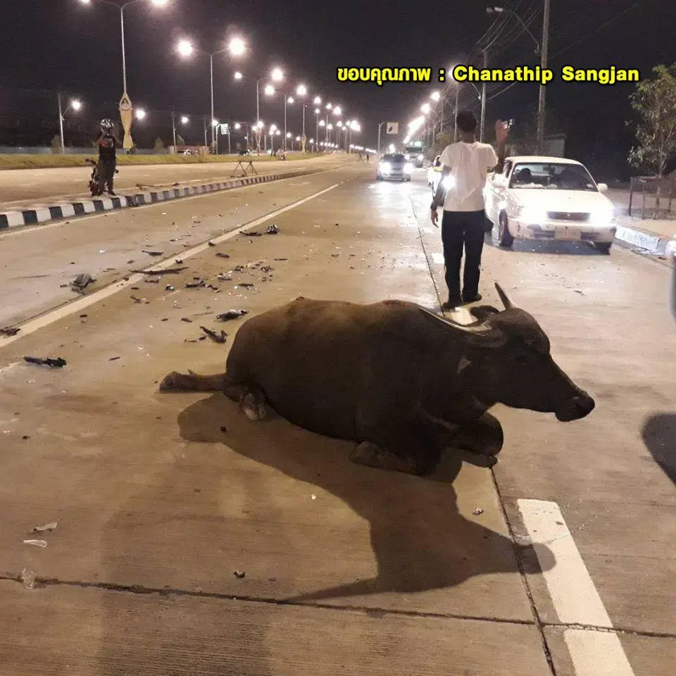 เจ้าควาย 2 ตัว ถูกรถชน เมื่อวันที่ (24 ก.ย. 61) บริเวณถนนศรีนครินทร์ - ร่มเกล้า (ตัดใหม่) ที่เกิดเหตุมีรถมาสด้าสีดำจอดอยู่ คนขับได้รับบาดเจ็บ ควายเผือก 1 ตัว ขาหัก 1 ข้าง และควายดำ 1 ตัว ขาหน้าหัก 2 ข้าง ขาหลักหัก 1 ข้าง และมีแผลถลอก
