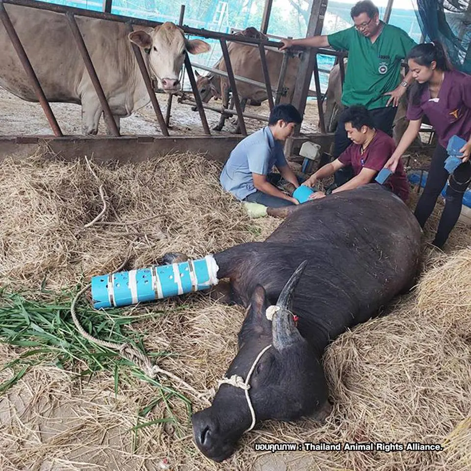 จากนั้นเจ้าควายทั้ง 2 ตัว ได้รับการดูแลรักษาจากมูลนิธิอนุรักษ์ช้าง ควายเผือก อายุ 3 ปี ชื่อเจ้ามงคล และควายดำ อายุ 3 ปี ชื่อเจ้ามังคุด ทางมูลนิธิแจ้งว่าเจ้ามังคุด ซึ่งมีอาการหนักกว่าเจ้ามงคล คือเจ้ามังคุด ได้รับบาดเจ็บ ขาหัก 4 ท่อน มีแผลกดทับติดเชื้อทั้งตัว ตอนนี้ผอมมาก โอกาสรอด 50/50 ต้องรอปาฎิหาริย์ ส่วนเจ้ามงคล ขาหัก 1 ข้าง เวลาเดินยังคงต้องพยุงตัว และมีแผลลึก แต่ทางคุณหมอได้ทำการเย็บเรียบร้อยแล้ว ให้ระวังแค่การติดเชื้อ