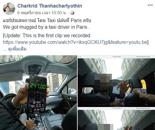 ซึ่งข้อความตามโพสต์ดังนี้ "แชร์ประสพการณ์ โดน Taxi ปล้นที่ Paris ครับ วันนี้ผมบินมาลงสนามบิน PARIS CHARLES de GAULLE แล้วเรียก Taxi กับน้องโบ Nisanart มาพักในโรงแรมในตัวเมื่องครับ