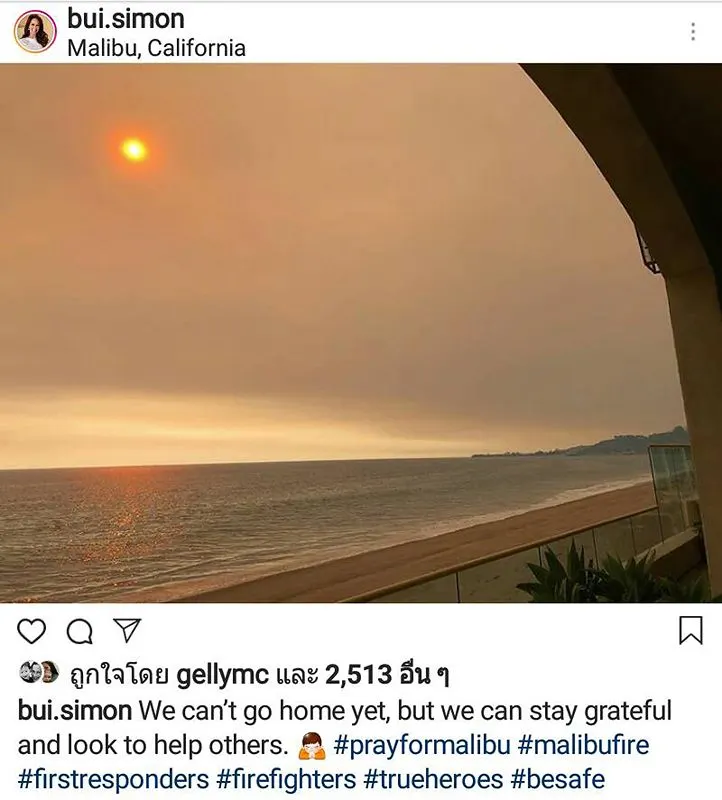 โดยเมื่อวันที่ 11 พ.ย. ปุ๋ย ภรณ์ทิพย์ ปุ๋ย ภรณ์ทิพย์ นางงามจักรวาลปี 1988 ขวัญใจชาวไทย ผู้ได้รับผลกระทบ โดยได้โพสต์อินสตาแกรมส่วนตัว เผยภาพควันไฟป่า และว่าตนเองและลูกๆ ต้องอพยพหนีไฟป่าอีกครั้ง โดยปุ๋ย ได้บอกด้วยว่า เธอขอสวดภาวนาให้กับผู้ที่ได้รับผลกระทบจากไฟป่าทุกคน