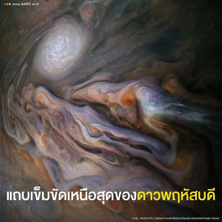 นาซาเผยภาพเกลียวเมฆในแถบเข็มขัดเหนือสุดของดาวพฤหัสบดีเรียกว่า แถบเข็มขัดเขตอบอุ่นเหนือ ฝั่งเหนือ (North-North Temperate Belt : NNTB) ถ่ายโดยยานอวกาศจูโน เมื่อวันที่ 29 ตุลาคม 2561 ที่ผ่านมา