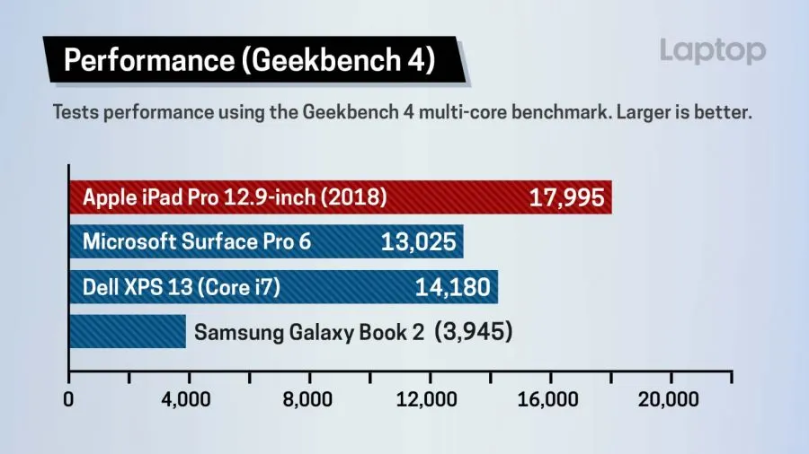 ในแง่ประสิทธิภาพหรือความแรงจากชิปเซ็ต A12X Bionic ที่แอปเปิลอ้างในคีย์โน้ตเปิดตัวว่าแรงกว่าแล็บท็อปหรือกราฟิคแรงระดับ Xbox One S นั้น จากการรันเบนช์มาร์คหรือทดสอบการเรนเดอร์ผ่าน Lightroom และ Photoshop รวมถึงแปลงไฟล์วิดิโอ 4K เป็น FHD ผ่าน Premier Rush (ที่ไฟล์ออกมาแค่ FHD เพราะ Premier Rush เอ็กซ์พอร์ทได้สูงสุดแค่นั้น) ก็พบว่าแรงและเร็วกว่าแท็บเล็ตหรือแม้แต่แล็บท็อปได้จริง