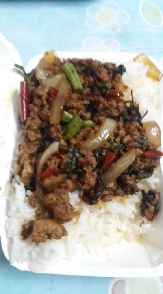 “สั่งอาหารกระเพราหมูสับ ใส่ถุงกับบ้านคะ ผัดปุปปับเรียบร้อย ใส่ถุงยื่นให้150บาท ป้ามัดยางยื่นถุงมาให้ กระเพราหมูสับนี้น่ะ 150บาท ฮู้ทำไมแพงจัง ถ้าราดข้าวล่ะ ถ้าเอาข้าวด้วยเพิ่ม50บาท ตกลงถ้าข้าวพร้อม 200 บาท โอ้ถ้า 150 กินกระเพรากุ้ง หมึก ไม่ดีกว่าเหรอ”