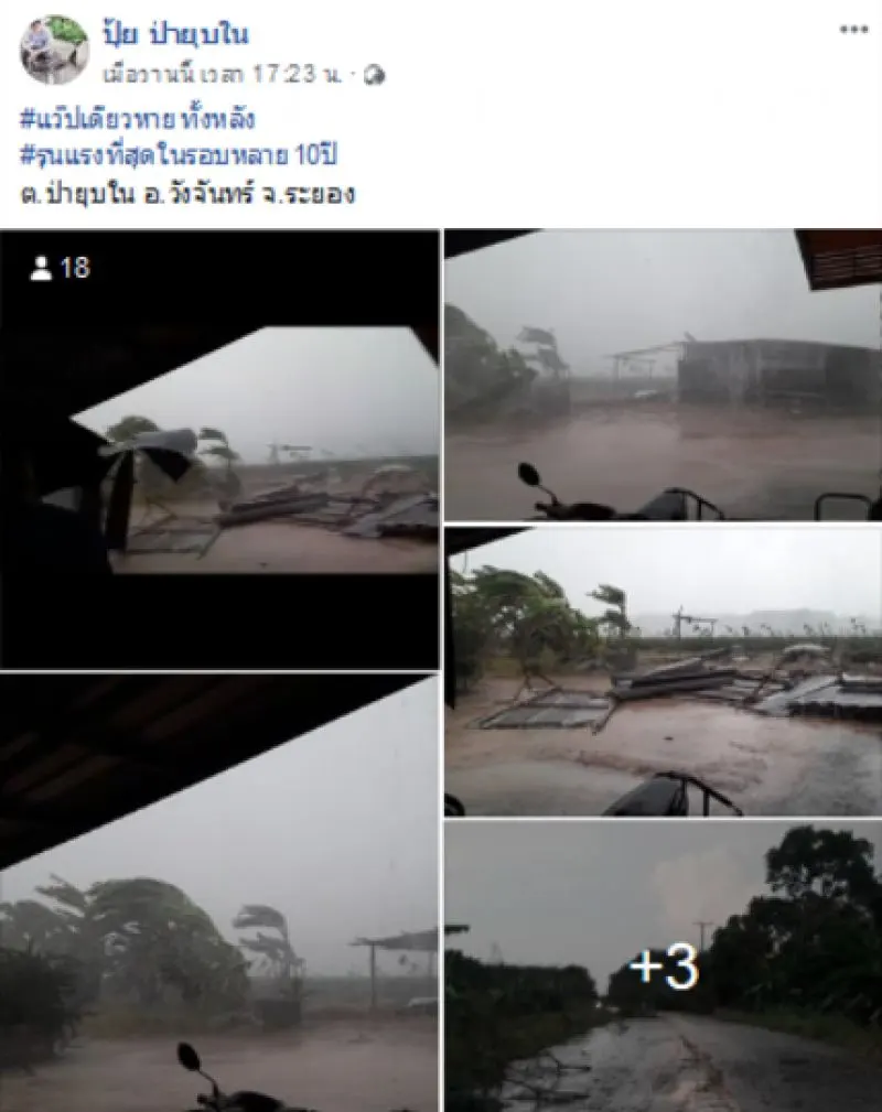 เรียกได้ว่าเป็นเหตุการณ์ที่เกิดขึ้นรวดเร็วและน่ากลัวอย่างมาก สำหรับพายุฝนที่พัดเอาบ้านทั้งหลังพังราบเป็นหน้ากลอง โดยผู้ใช้เฟสบุ๊คที่ใช้ชื่อว่า ปุ้ย ป่ายุบใน ได้โพสต์คลิปพร้อมเรื่องราวระบุว่า…#แว๊ปเดียวหายทั้งหลัง#รุนแรงที่สุดในรอบหลาย10ปีต.ป่ายุบใน อ.วังจันทร์ จ.ระยอง