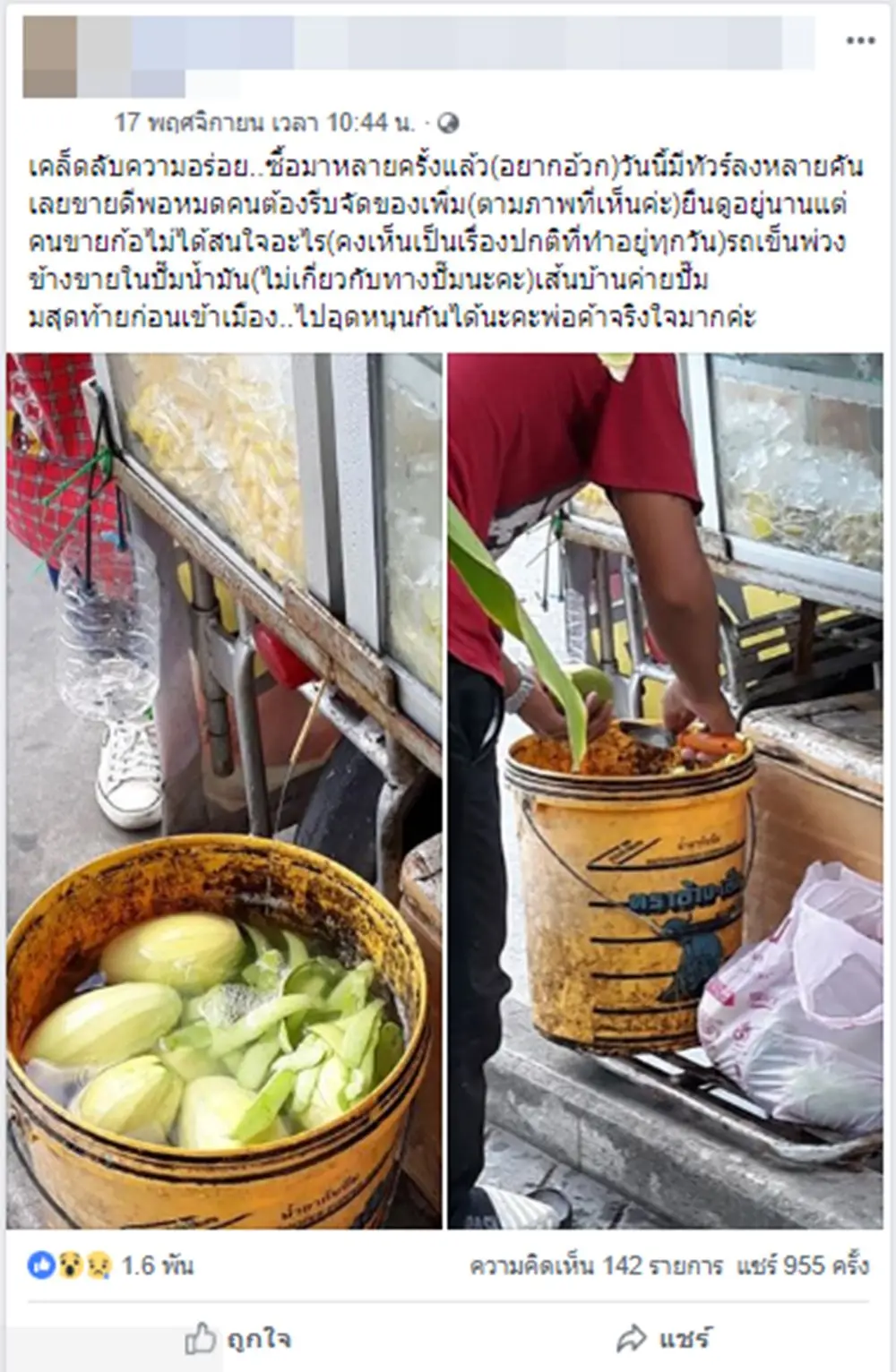 เมื่อมีผู้ใช้เฟซบุ๊กรายหนึ่งออกมาเผยแพร่เรื่องราวของพ่อค้าขายผลไม้เจ้าหนึ่ง ที่ปั๊มน้ำมันภายในจังหวัดระยอง โดยภาพที่นำมาเผยแพร่นั้นเป็นภาพที่พ่อค้ากำลังยืนปอกมะม่วงและเอาแช่ลงไปในถังน้ำที่ใช้สำหรับรองน้ำแข็งที่ละลายมาจากตู้แช่ผลไม้ ทั้งนี้ถังน้ำใบดังกล่าวยังมีคราบสีดำๆติดอยู่เต็มถังอีกด้วย