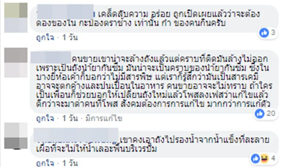 นอกจากนี้ได้มีเพื่อนของพ่อค้าคนดังกล่าวนั้นได้ออกมาช่วยชี้แจงว่า ถังสีเหลืองในรูปที่เห็นว่ามีคราบดำๆติดอยู่นั้น ไม่ใช่ถังขยะอย่างที่ทุกคนเข้าใจ แต่คราบสีดำๆนั้นคือ ยาง เพราะถังดังกล่าวนั้นเป็นถังยาง พร้อมทั้งบอกด้วยว่าร้านนี้สะอาด และได้มีชาวเน็ตเข้ามาแสดงความคิดเห็นเพิ่มเติมว่า เห็นคนทำงานด้วยอาชีพสุจริตก็อยากที่จะอุดหนุน โดยได้สังเกตน้ำในถังนั้นก็ดูใสสะอาดดี แต่ตัวถังอาจจะล้างไม่ออกเลยมีคราบดำติดอยู่ คนอื่นเลยมองพากันว่าสกปรก