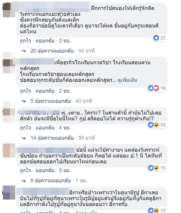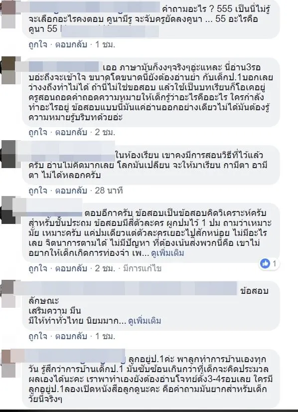 อย่างไรก็ตาม ภายหลังจากเรื่องดังกล่าวได้รับการเผยแพร่ออกไป ชาวเน็ตต่างเข้ามาแสดงความเห็นกันอย่างมากมาย อาทิ ขนาดครูเอง ถึงกับต้องอ่านอีกสองรอบ เพื่อความแน่ใจ, ฝึกการใช้สมองให้เด็กรู้จักคิดวิเคราะห์แยกแยะด้วยตัวเอง ซึ่งควรฝึกสอนกันตั้งแต่เด็ก ต้องถือว่าข้อนี้ดูไม่เลวทีเดียว ดูน่าจะได้ผล ขึ้นอยู่กับครูจะสอนดีแค่ไหน, ข้อนี้ แม้จะใช้คำง่ายๆ แต่ต้องวิเคราะห์ซับซ้อน ถ้าบอกว่าเป็นระดับมัธยม ก็พอได้ แต่ของ ป.1 นี่ ไล่ทีมที่ออกข้อสอบออกไปเรียนมาใหม่ก่อนเลย เป็นต้น