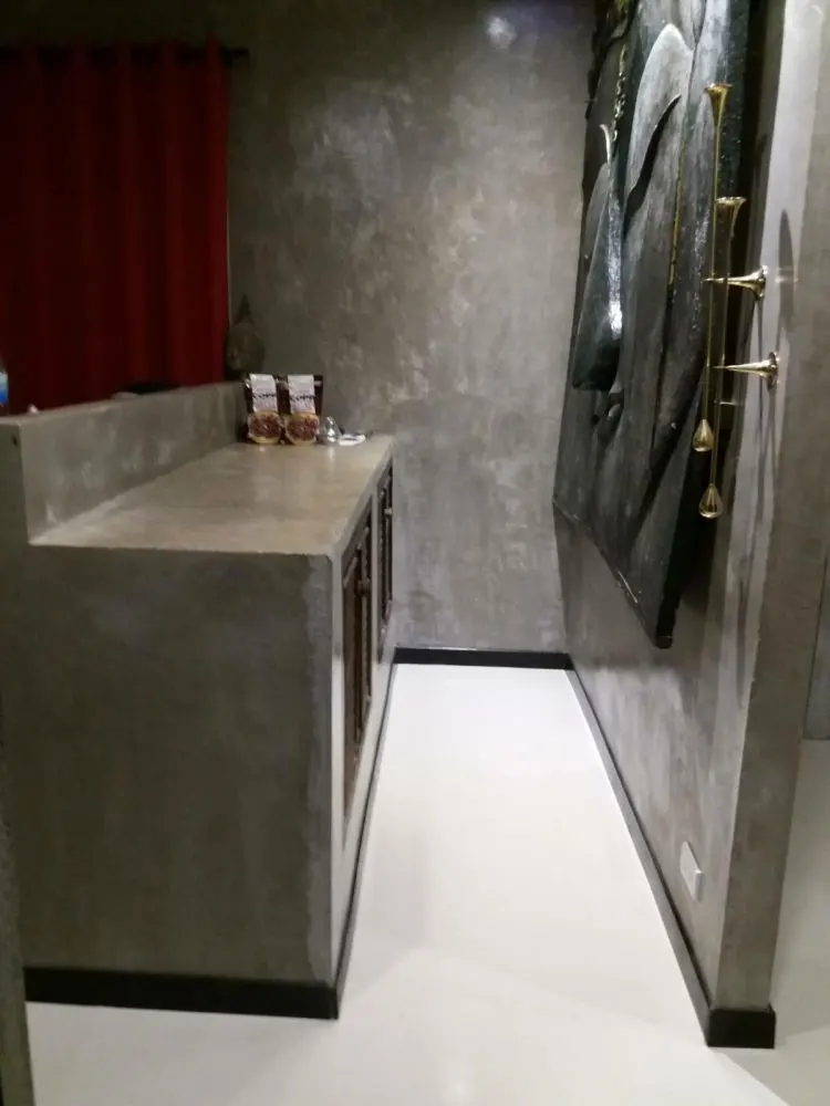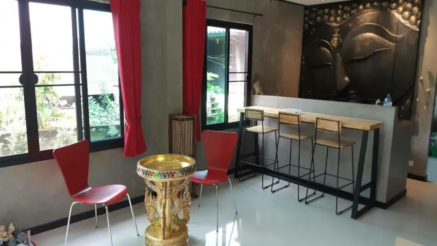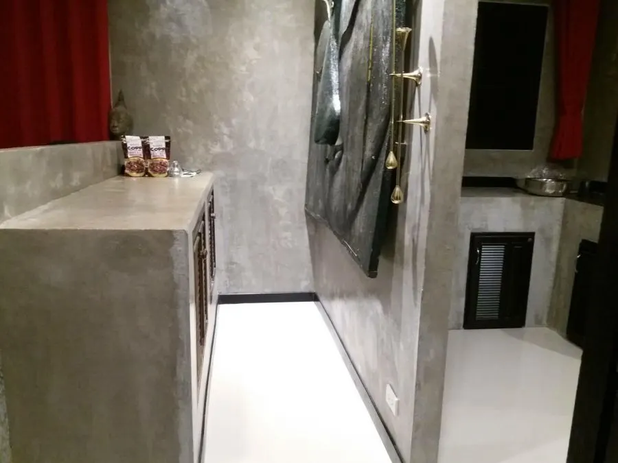 โก้- หลังคาเพิงหมาแหงน เป็นแบบโมเดิร์น และทำผนังปูนเปลือยขัดมัน.