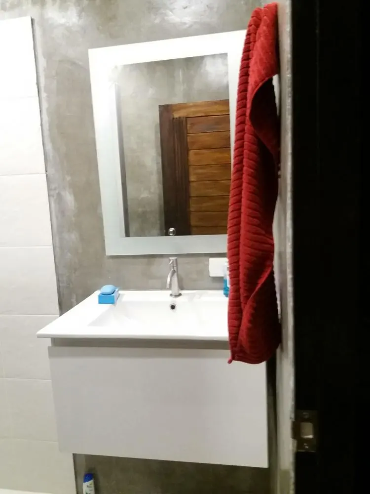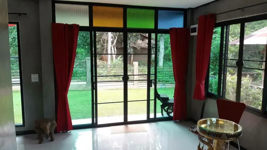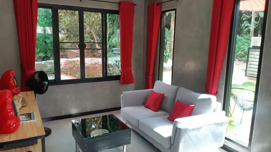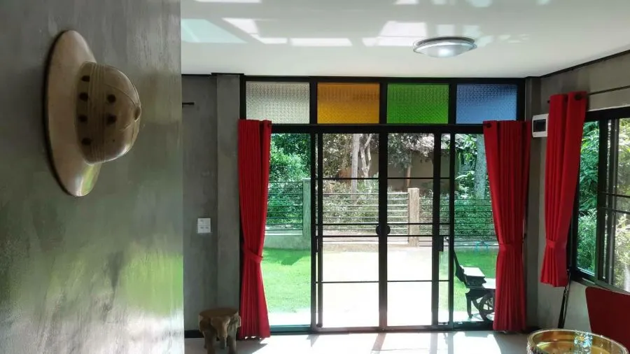 เลือกใช้ผ้าม่านสีแดงเรียบ ๆ ตัดกับผนังปูนเปลืยเป็นอย่างดี. ทำให้บ้านดูมีสีสัน ภายนอกบ้านก็จะเน้นเรียบง่ายเฉพาะสีเขียวของสนามหญ้าหน้าบ้าน. แต่ก็จะมีร่มกับเก้าอี้สนามเก๋ๆ