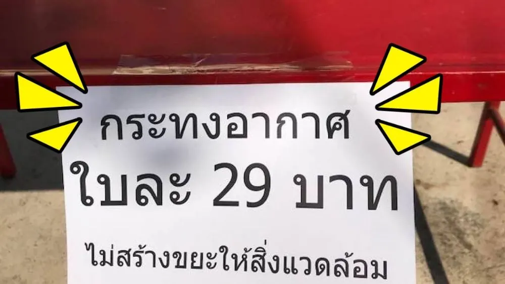 ผู้ใช้เฟซบุ๊กคุณ Supakin Denduang ได้โพสต์ภาพโต๊ะว่างเปล่าตัวหนึ่ง พร้อมป้ายกระดาษที่ระบุข้อความว่า “กระทงอากาศ ใบละ 29 บาท ไม่สร้างขยะให้สิ่งแวดล้อม” ซึ่งเรียกความสนใจจากผู้คนในโลกออนไลน์เป็นอย่างมาก แถมผู้โพสต์ยังระบุข้อความไว้ด้วยว่า…