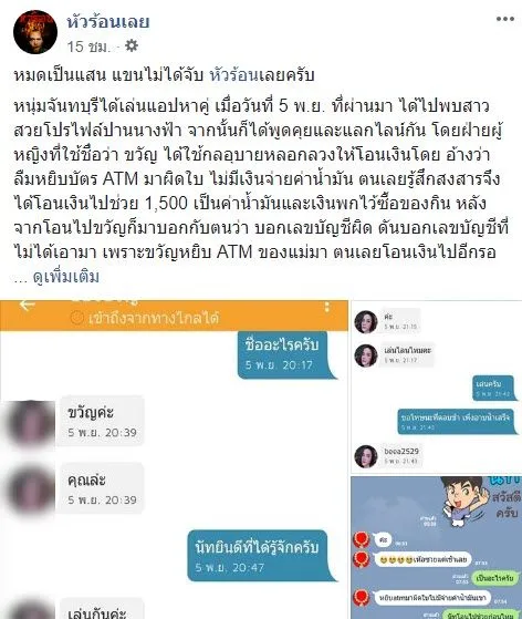 หมดเป็นแสน แขนไม่ได้จับ หัวร้อนเลยครับ หนุ่มจันทบุรีได้เล่นแอปหาคู่ เมื่อวันที่ 5 พ.ย. ที่ผ่านมา ได้ไปพบสาวสวยโปรไฟล์ปานนางฟ้า จากนั้นก็ได้พูดคุยและแลกไลน์กัน โดยฝ่ายผู้หญิงที่ใช้ชื่อว่า ขวัญ ได้ใช้กลอุบายหลอกลวงให้โอนเงินโดย อ้างว่าลืมหยิบบัตร ATM มาผิดใบ ไม่มีเงินจ่ายค่าน้ำมัน ตนเลยรู้สึกสงสารจึงได้โอนเงินไปช่วย 1,500 เป็นค่าน้ำมันและเงินพกไว้ซื้อของกิน หลังจากโอนไปขวัญก็มาบอกกับตนว่า บอกเลขบัญชีผิด ดันบอกเลขบัญชีที่ไม่ได้เอามา เพราะขวัญหยิบ ATM ของแม่มา ตนเลยโอนเงินไปอีกรอบในบัญชีของแม่ และยังเล่าเรื่องราวความลำบากของขวัญมากมาย และขวัญได้ขอยืมเงินเพิ่ม ตนเห็นใจเลยได้โอนเงินให้ยืมไป อีกทั้งยังย้ำกับตนว่า "กลับบ้านคืนให้แน่" จนกระทั่งโอนไปร่วมแสน ตนเริ่มรู้สึกไม่มั่นใจจึงได้ขอรูปบัตรประชาชน แต่ฝ่ายหญิงยังอ้างว่า "ไม่ได้พกมา ถ้าขวัญจะโกงนะ คงติดต่อขวัญไม่ได้แล้วละ"