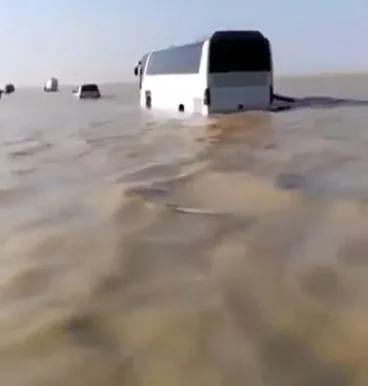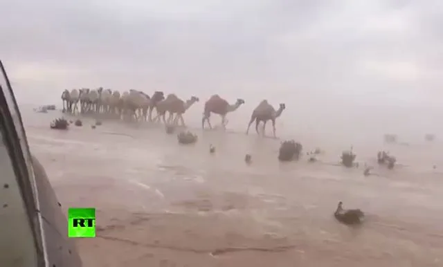 เกิดเหตุน้ำท่วมฉับพลันกลางทะเลทรายหลายจุดของซาอุดิอาระเบีย ทั้งในกรุงริยาด และเมืองต่าง ๆ หลังเกิดพายุทรายพัดถล่มและฝนตกหนักในหลายพื้นที่ เหตุน้ำท่วมที่เกิดขึ้นทำให้ทั้งคนและอูฐต้องเดินลุยน้ำท่วมกลางทะเลทราย และมีรถยนต์หลายคันถูกน้ำท่วม