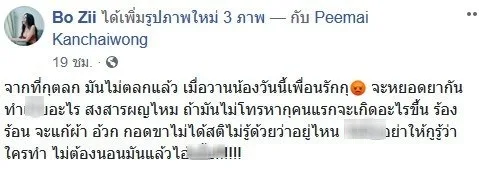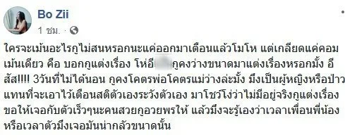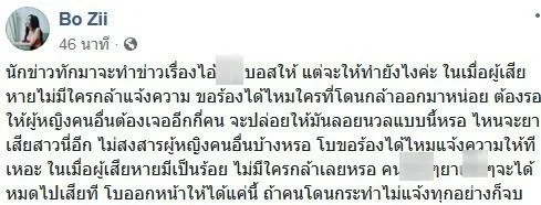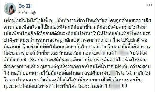 ทั้งนี้Bo Ziiก็ได้โพสท์รายระเอียดเพิ่มเติมระบุว่า เพื่อนโบมันไม่ได้ไปเที่ยว... มันทำงานพีอาร์ในเล้าจ์แต่โดนลูกค้าหยอดยาเสียสาว ก่อนเพื่อนโดนก็เป็นน้องที่โดนตีกับข่มขืน. คดีน้องยังจับคนร้ายไม่ได้มาเป็นเพื่อนโดนอีกดีที่ก่อนสติมันจะตัดมันโทรหาโบให้โบคุยกับแท็กซี่